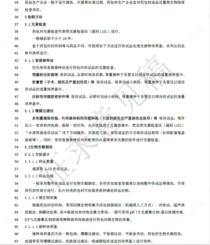 4.对检测方法的说明由于药包材种类繁多,难以针对每个品种给出具体的、明确的试验方法及参数,同时考虑生产企业方法建立个性化、自主性的需求,本指导原则给出了无菌检查、生物负载测定和微生物限度检查方法设计和确认的指南,不同类型药包材生产企业可以根据本指导原则建立方法并完成方法确认后,在常规检测中采用确认的方法实施日常检测。